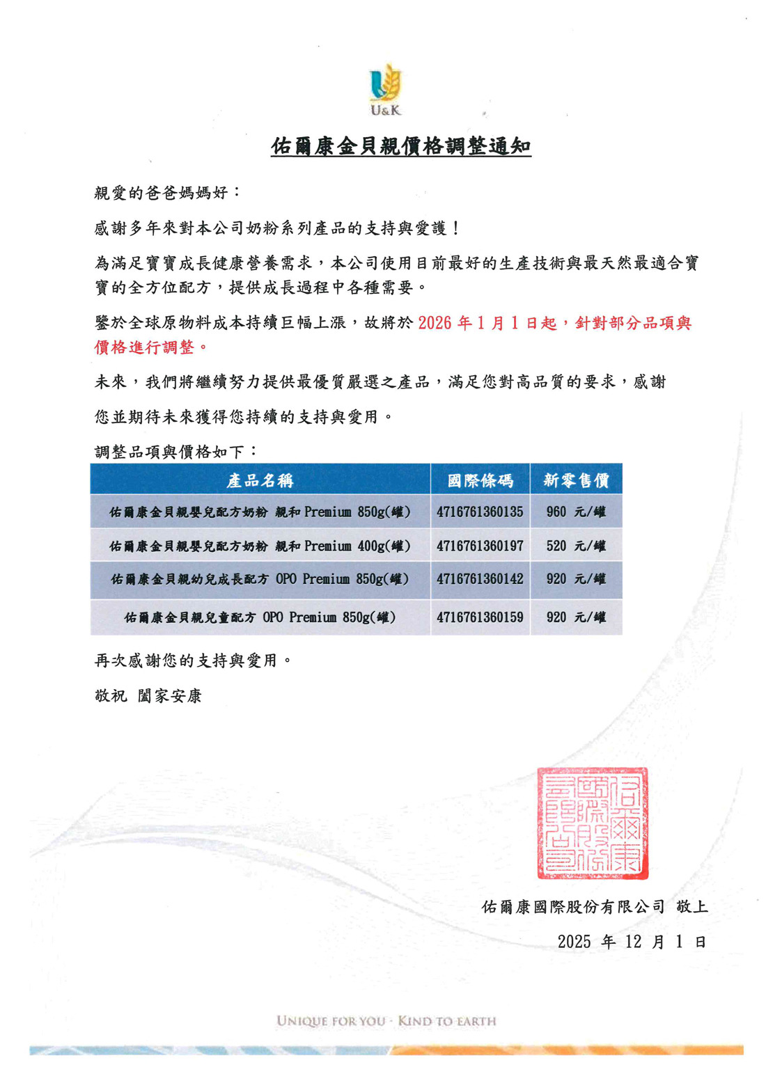 佑爾康金貝親 價格調整通知