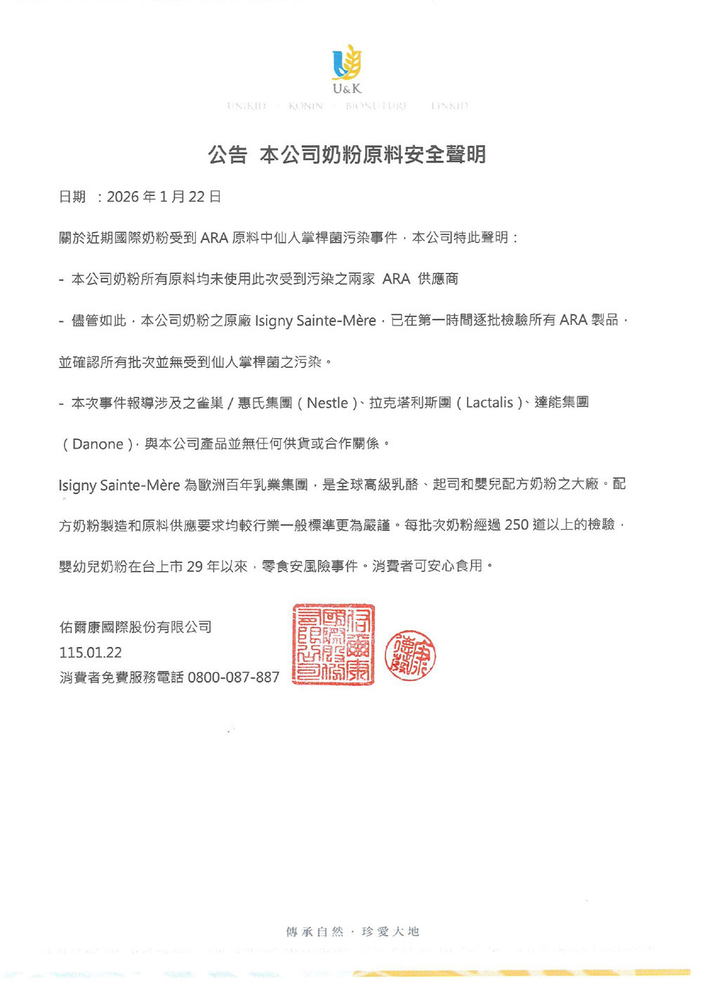 佑爾康 奶粉原料安全聲明
