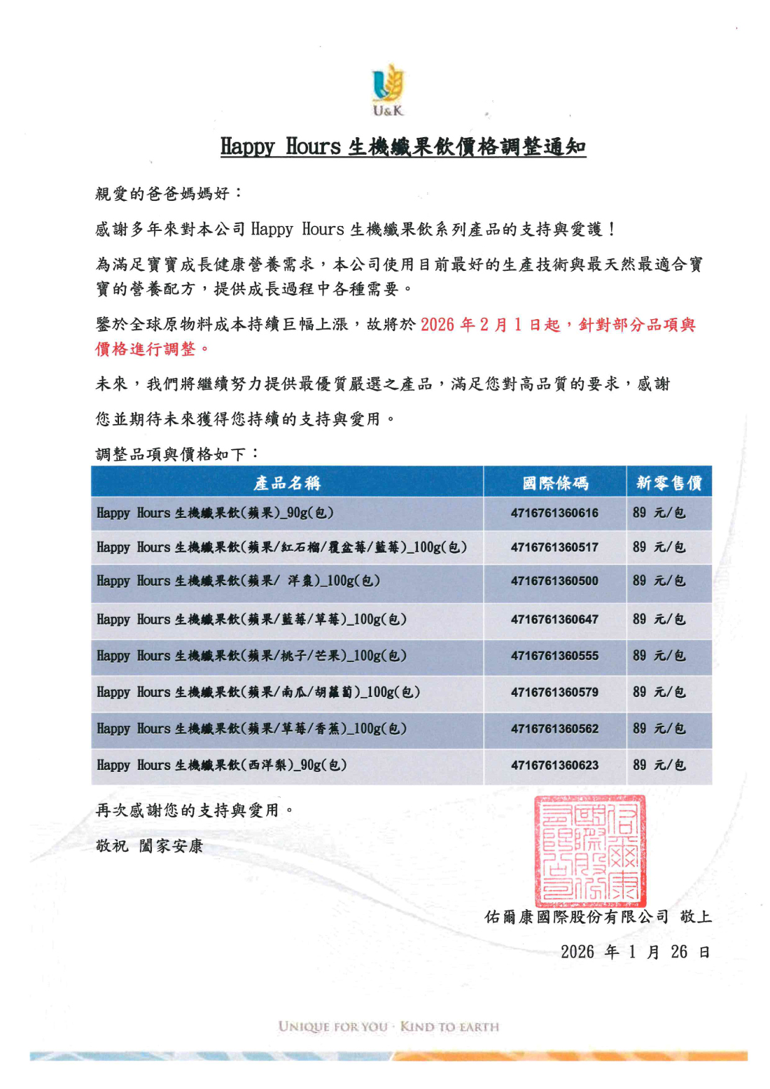 Happy Hours生機纖果飲價格調整公告