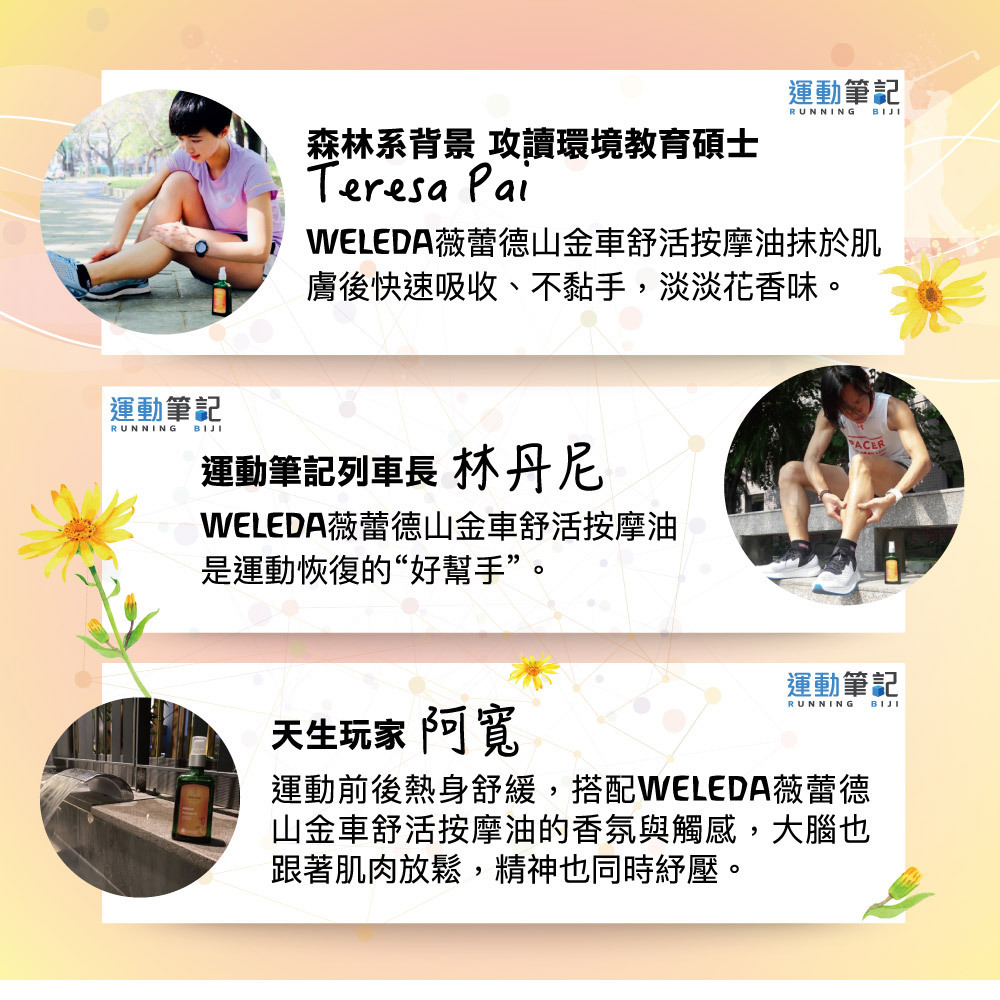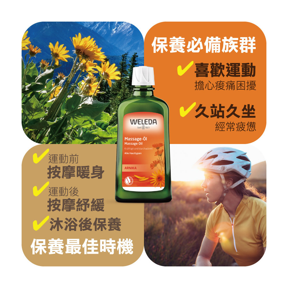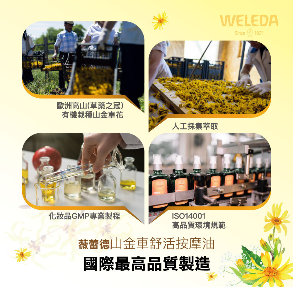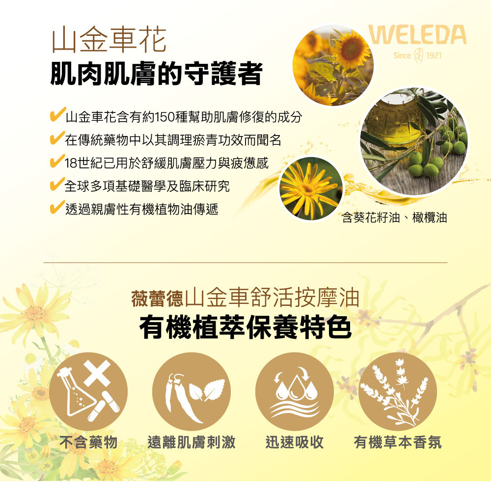 ▪ 山金車堪稱植物裡的永久花,油狀質地溫暖好吸收,取適量塗抹於肌膚,並以畫圓方式由外而內輕輕按摩,緩解肌膚壓力。
