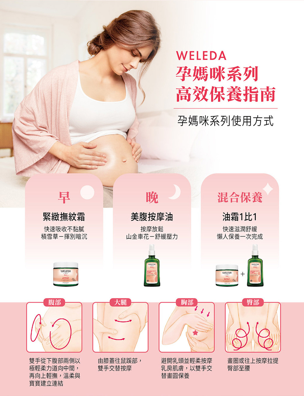 ‧每日2-3次輕輕按摩腹部、胸部、大腿、臀部等全身肌膚,建議從懷孕開始使用至產後3個月。