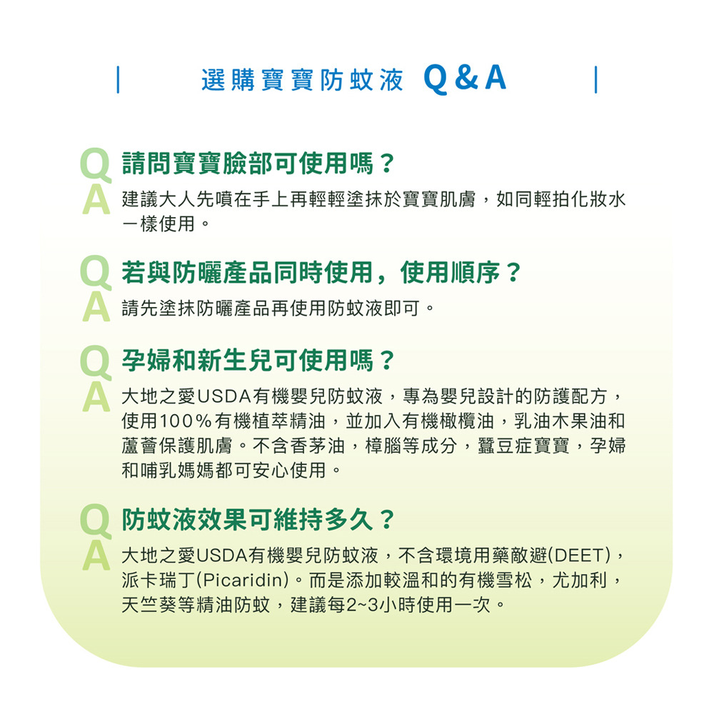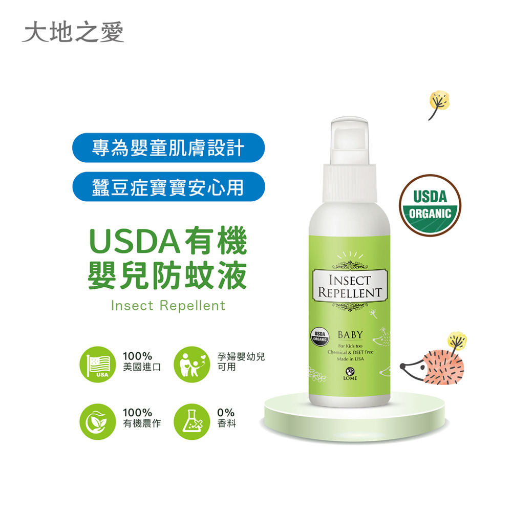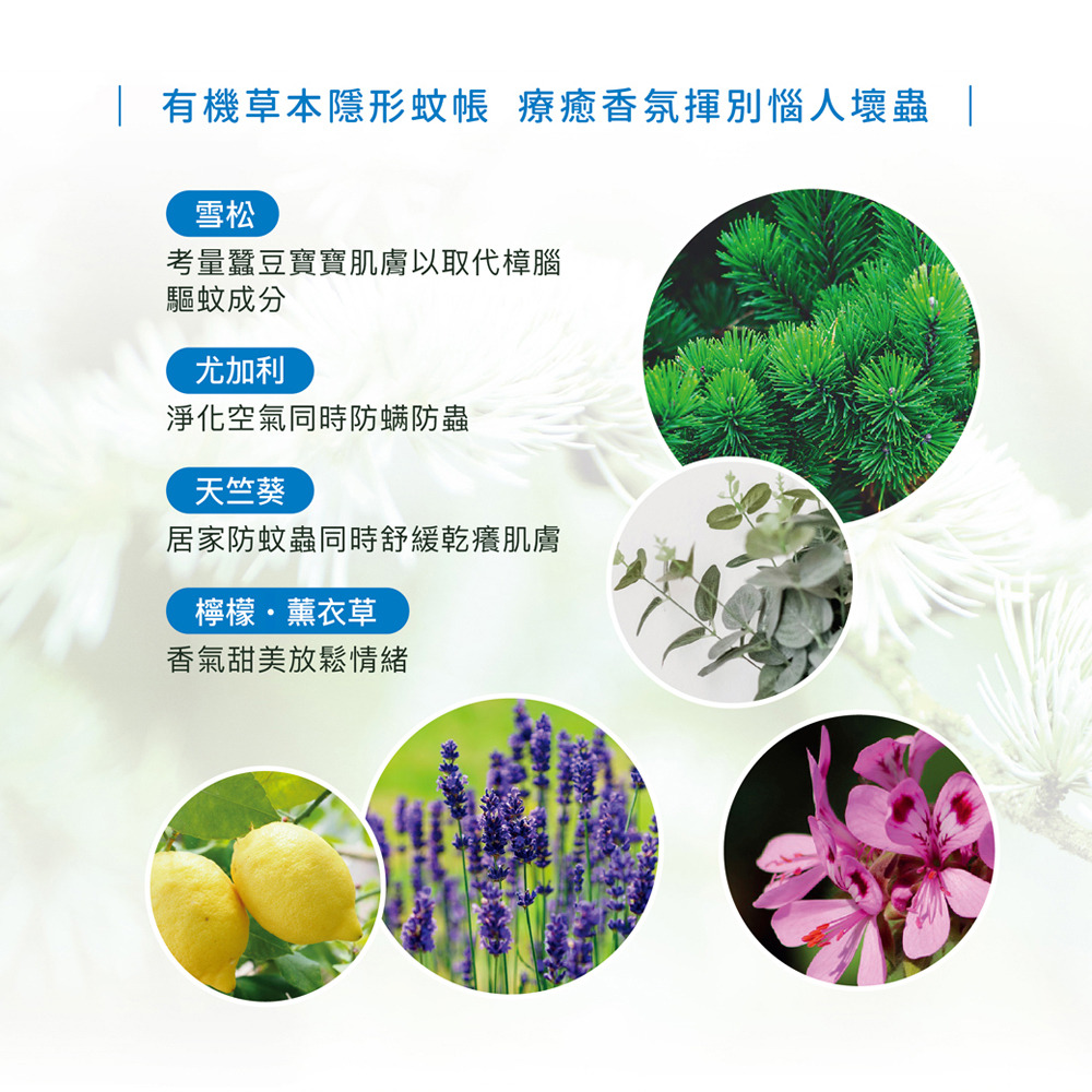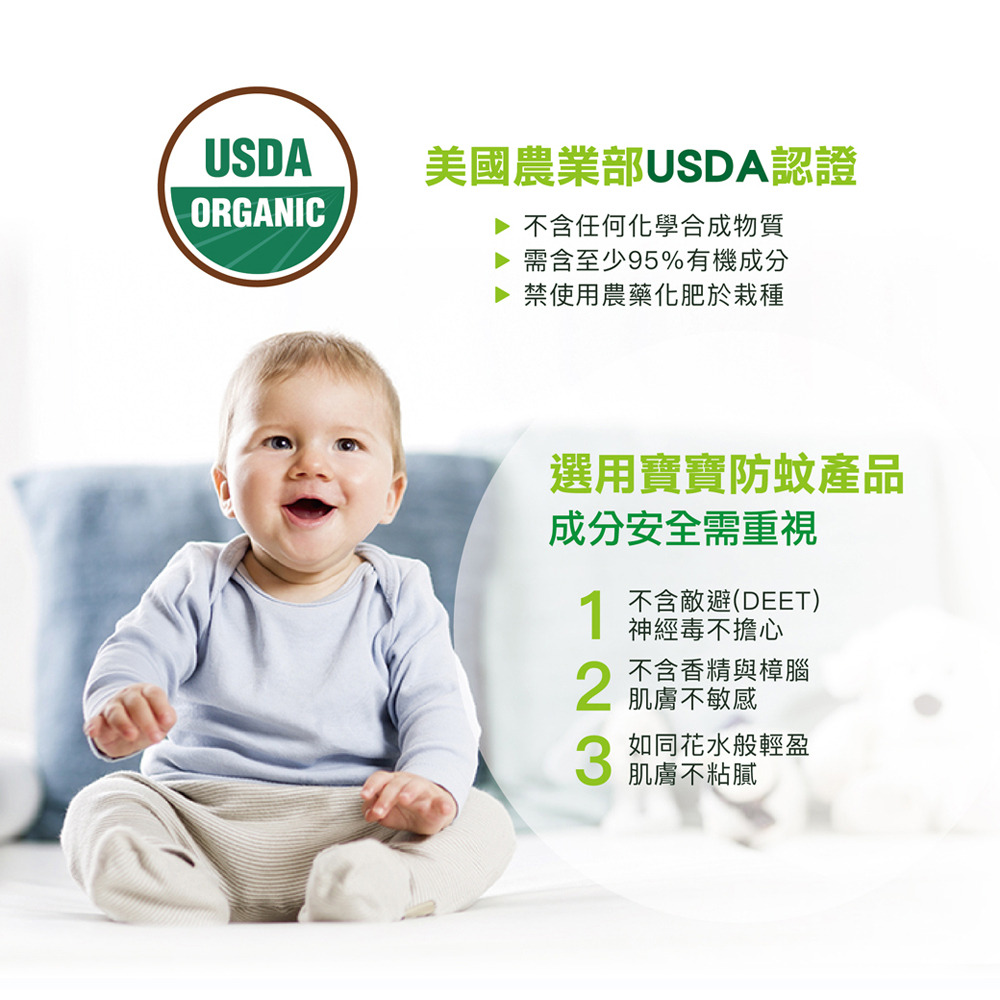 ‧含有機玫瑰天竺葵、有機雪松、有機尤加利、有機檸檬、有機薰衣草等天然植物精油,氣味清新淡雅,可有效驅趕蚊蟲,通過美國最高等級USDA有機認證。
