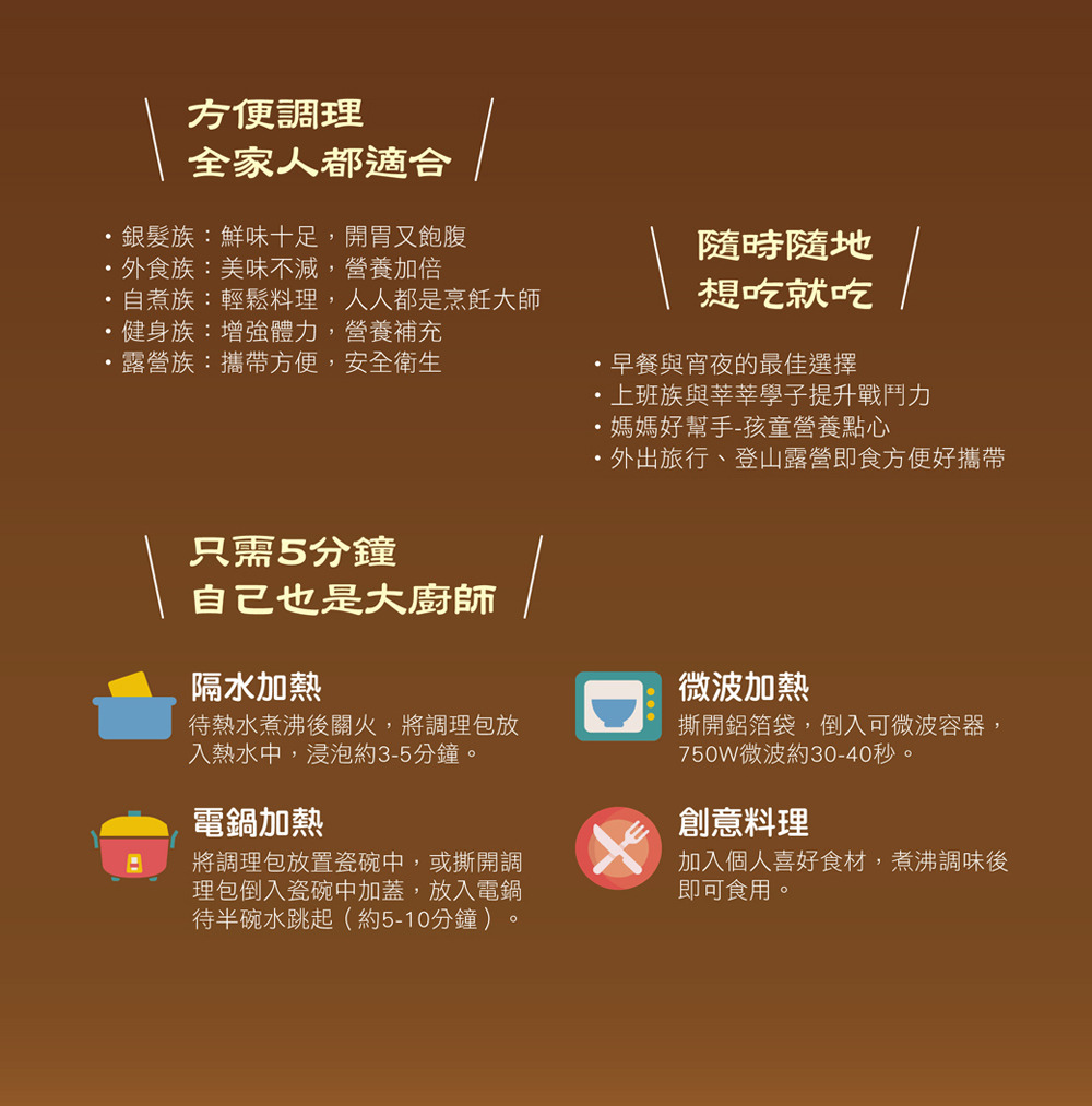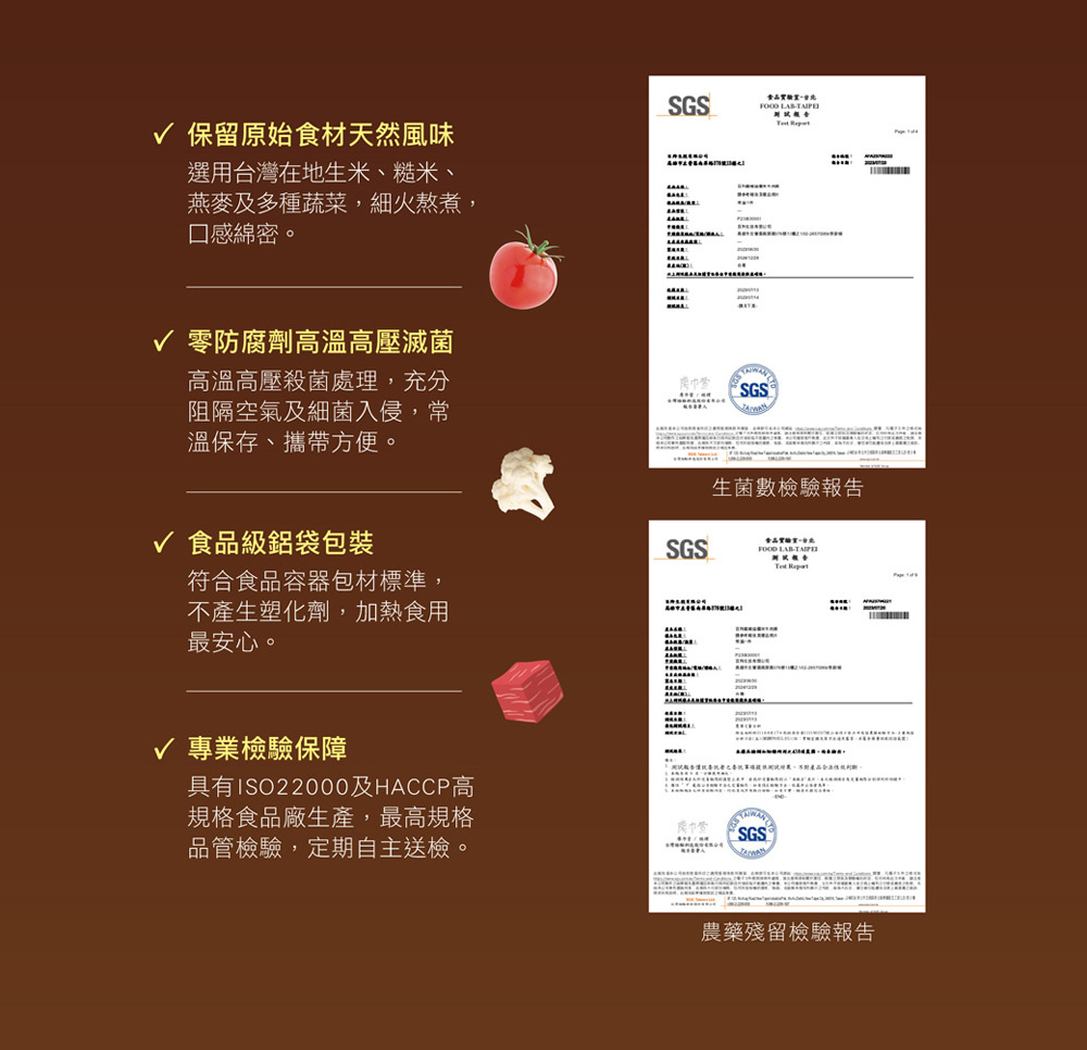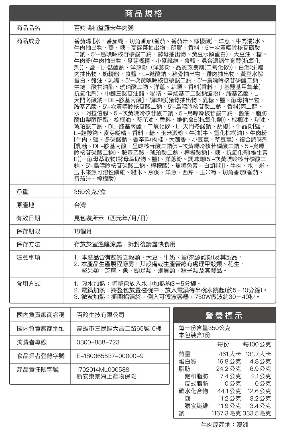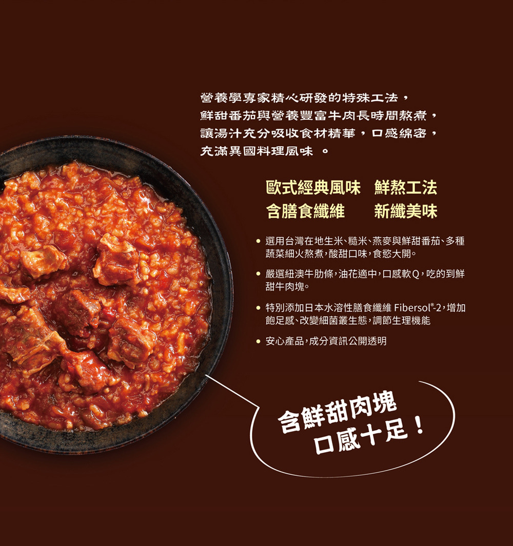 歐式經典風味.鮮熬工法.含膳食纖維.新纖美味 ✓ 選用台灣在地生米、糙米、燕麥與鮮甜番茄、多種蔬菜細火熬煮,酸甜口味,食慾大開。 ✓ 嚴選紐澳牛肋條,油花適中,口感軟Q,吃的到鮮甜牛肉塊。。 ✓ 添加日本水溶性膳食纖維Fibersol®-2,增加飽足感、改變細菌叢生態,調節生理機能。 ✓ 安心產品,成分資訊公開透明。