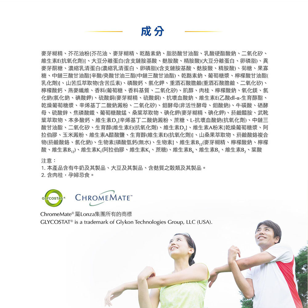 麥芽糊精、芥花油粉[芥花油、麥芽糊精、乾酪素鈉、脂肪酸甘油酯、乳酸硬酯酸鈉、二氧化矽、維生素E(抗氧化劑)]、大豆分離蛋白(含支鏈胺基酸、麩胺酸、精胺酸)(大豆分離蛋白、卵磷脂)、異麥芽酮糖、濃縮乳清蛋白(濃縮乳清蛋白、卵磷脂)(含支鏈胺基酸、麩胺酸、精胺酸)、菊糖、果寡糖、中鏈三酸甘油酯[辛酸/癸酸甘油三酯(中鏈三酸甘油酯)、乾酪素鈉、葡萄糖漿、檸檬酸甘油酯(乳化劑)]、山苦瓜萃取物(含苦瓜素)、磷酸鈣、氯化鉀、重酒石酸膽鹼(重酒石酸膽鹼、二氧化矽)、檸檬酸鈣、燕麥纖維、香料(葡萄糖、香料基質、二氧化矽)、肌醇、肉桂、檸檬酸鈉、氧化鎂、氯化鈉(氯化鈉、碘酸鉀)、硫酸銅(麥芽糊精、硫酸銅)、抗壞血酸鈉、維生素E[乙酸dl-α-生育醇酯(維生素E)、乾燥葡萄糖漿、辛烯基丁二酸鈉澱粉、二氧化矽)]、鉬酵母(非活性酵母、鉬酸鈉)、牛磺酸、硒酵母、硫酸鋅、焦磷酸鐵、葡萄糖酸錳、桑葉萃取物、碘化鉀(麥芽糊精、碘化鉀)、菸鹼醯胺、武靴葉萃取物、本多酸鈣、維生素D3[辛烯基丁二酸鈉澱粉、蔗糖、L-抗壞血酸鈉(抗氧化劑)、中鏈三酸甘油酯、二氧化矽、生育醇(維生素E)(抗氧化劑)、維生素D3]、維生素A粉末[乾燥葡萄糖漿、阿拉伯膠、玉米澱粉、維生素A醋酸鹽、生育醇(維生素E)(抗氧化劑)]、山桑果萃取物、菸鹼酸鉻複合物(菸鹼酸鉻、氯化鈉)、生物素[磷酸氫鈣(無水)、生物素]、維生素B12(麥芽糊精、檸檬酸鈉、檸檬酸、維生素B12)、維生素K1(阿拉伯膠、維生素K1、蔗糖 )、維生素B6、維生素B1、維生素B2、葉酸