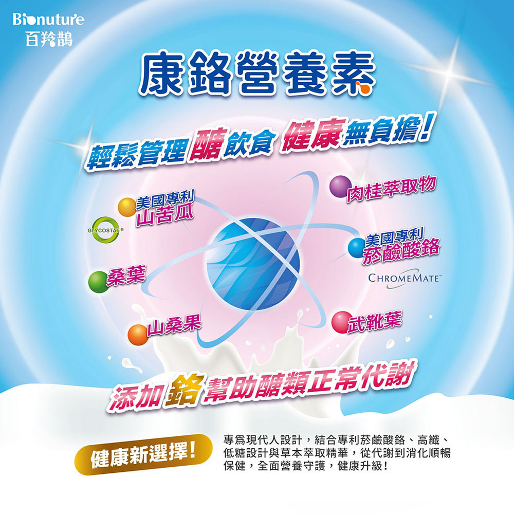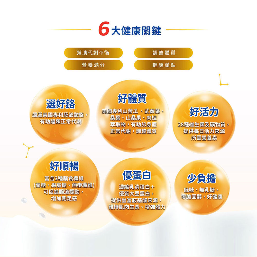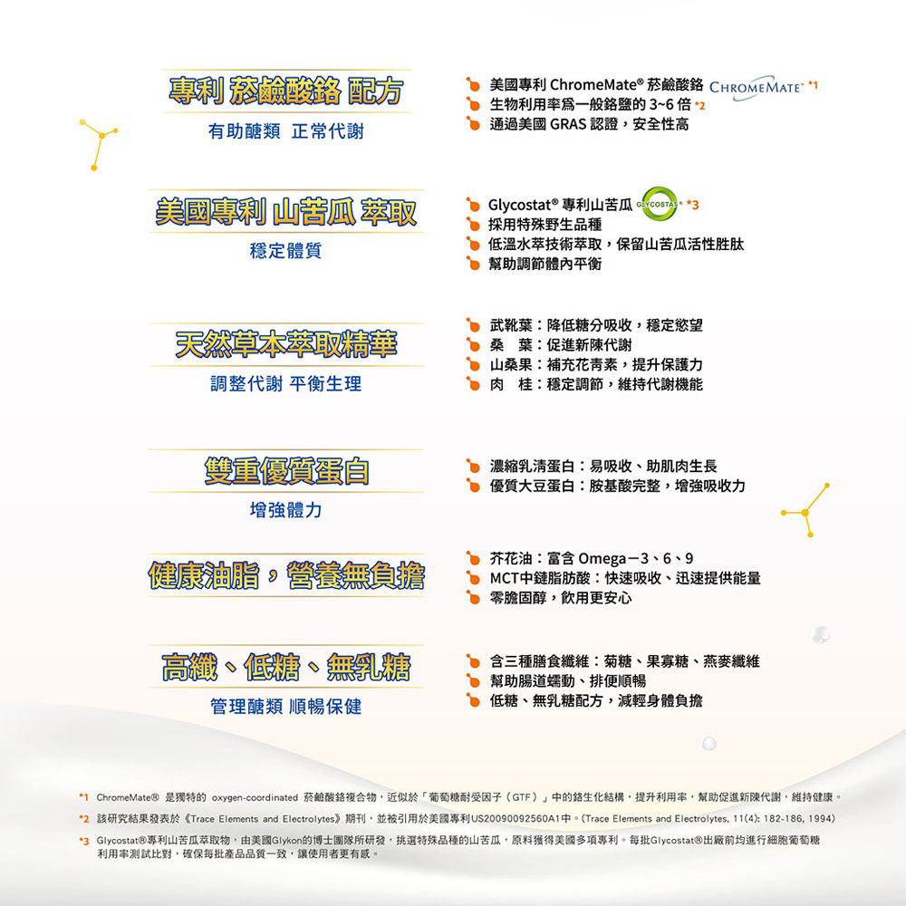 專為現代人設計,結合專利菸鹼酸鉻、高纖、低糖設計與草本萃取精華,從代謝到消化順暢保健,全面營養守護,健康升級!