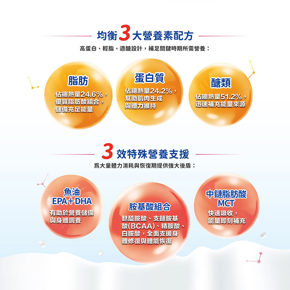 三效特殊營養支援,為大量體力消耗與恢復期提供強大後盾