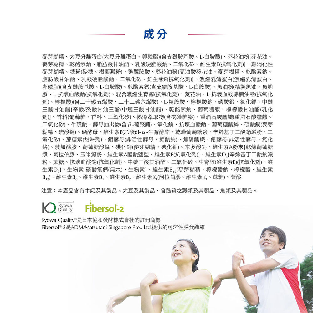 麥芽糊精、大豆分離蛋白(大豆分離蛋白、卵磷脂)(含支鏈胺基酸(L-白胺酸、L-α胺基異戊酸、L-異白胺酸)、L-精胺酸)、糖粉(砂糖、樹薯澱粉)、芥花油粉【芥花油、麥芽糊精、乾酪素鈉、脂肪酸甘油酯、乳酸硬酯酸鈉、二氧化矽、維生素E(抗氧化劑)】、難消化性麥芽糊精、麩醯胺酸、高油酸葵花油粉【高油酸葵花油、麥芽糊精、乾酪素鈉、脂肪酸甘油脂、乳酸硬脂酸鈉、二氧化矽、維生素E(抗氧化劑)】、濃縮乳清蛋白(濃縮乳清蛋白、卵磷脂)(含支鏈胺基酸(L-白胺酸、L-異白胺酸、L-α胺基異戊酸)、L-精胺酸))、 乾酪素鈣、魚油粉【精製魚油、魚明膠、L-抗壞血酸鈉(抗氧化劑)、混合濃縮生育醇(抗氧化劑)、葵花油、L-抗壞血酸棕櫚油酯(抗氧化劑)、檸檬酸】(含二十碳五烯酸、二十碳六烯酸、L-精胺酸、檸檬酸鉀、中鏈三酸甘油酯【辛酸/癸酸甘油三酯(中鏈三酸甘油酯)、乾酪素鈉、葡萄糖漿、檸檬酸甘油酯(乳化劑)】、磷酸鈣、檸檬酸鈉、氯化鈉(氯化鈉、碘酸鉀)、重酒石酸膽鹼(重酒石酸膽鹼、二氧化矽)、褐藻萃取物(含褐藻糖膠)、氯化鉀、百香果香料(葡萄糖、香料(含丙二醇)、二氧化矽)、綜合水果香料(葡萄糖、香料(含丙二醇)、二氧化矽)、牛磺酸、酵母抽出物(含β-葡聚糖)、氧化鎂、抗壞血酸鈉、碳酸鈣、乙基香莢蘭醛、L-肉酸、硫酸銅(麥芽糊精、硫酸銅)、維生素E【乙酸 dl-α-生育醇酯、乾燥葡萄糖漿、辛烯基丁二酸鈉澱粉、二氧化矽】、硒酵母、硫酸鋅、鉬酵母(非活性酵母、鉬酸鈉)、蔗糖素(甜味劑)、鉻酵母(非活性酵母、氯化鉻)、焦磷酸鐵、菸鹼醯胺、葡萄糖酸錳、碘化鉀(麥芽糊精、碘化鉀)、本多酸鈣、維生素A粉末[乾燥葡萄糖漿、阿拉伯膠、玉米澱粉、維生素A醋酸鹽型、維生素E(抗氧化劑)]、維生素D3[辛烯基丁二酸鈉澱粉、蔗糖、L-抗壞血酸鈉(抗氧化劑)、中鏈三酸甘油酯、二氧化矽、生育醇(維生素E)(抗氧化劑)、維生素D3]、生物素[磷酸氫鈣(無水)、生物素]、維生素B12(麥芽糊精、檸檬酸鈉、檸檬酸、維生素B12)、維生素B6、維生素B1、維生素B2、維生素K1(阿拉伯膠、維生素K1、蔗糖 )、葉酸
