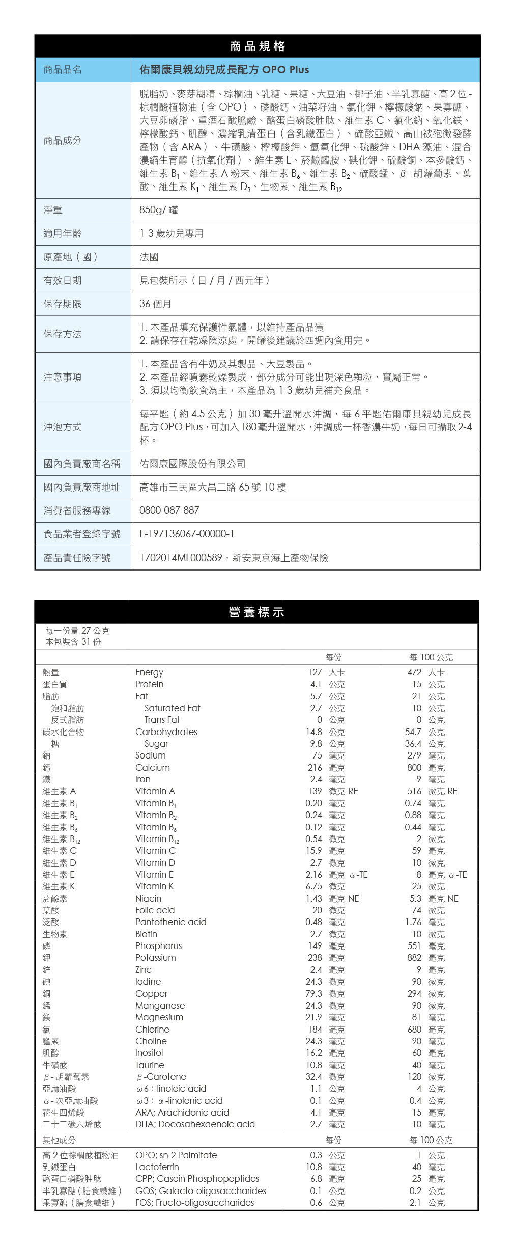 佑爾康金貝親 幼兒成長配方 OPO Premium 850g/罐