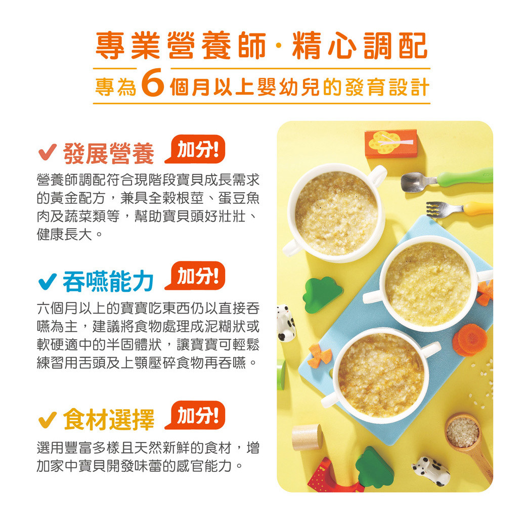 ✓ 發展營養-營養師調配符合現階段寶貝成長需求的黃金配方,兼具全榖根莖、蛋豆魚肉及蔬菜類等,幫助寶貝頭好壯壯、健康長大。