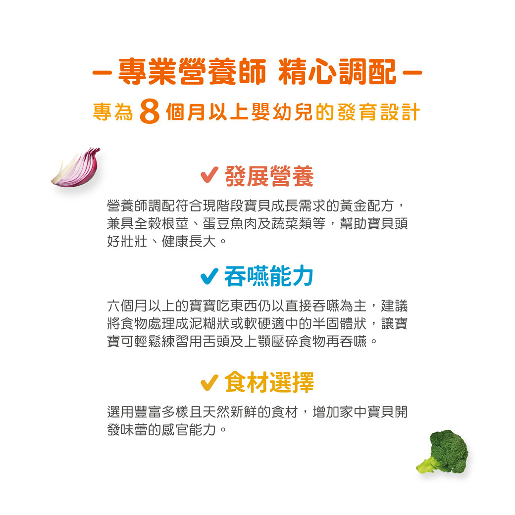 ✓ 食材選擇-選用豐富多樣且天然新鮮的食材,增加家中寶貝開發味蕾的感官能力。