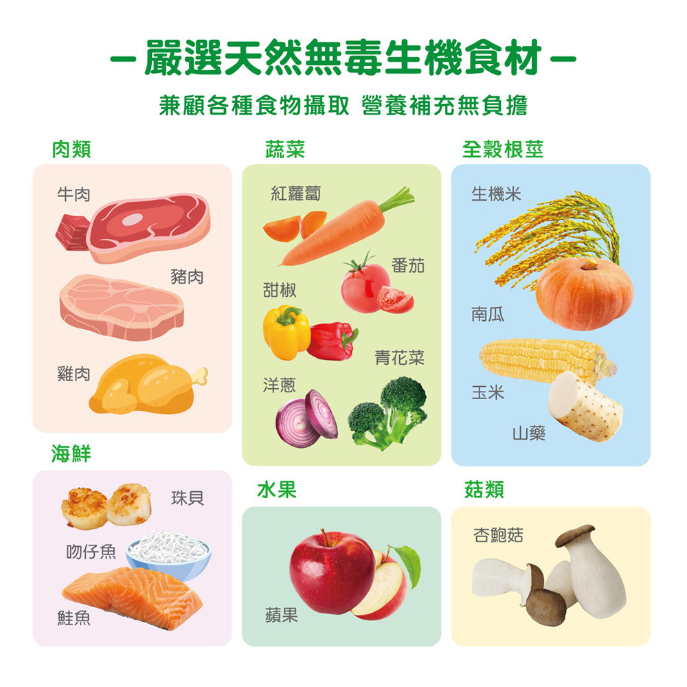 ✓ 食材選擇-選用豐富多樣且天然新鮮的食材,增加家中寶貝開發味蕾的感官能力。