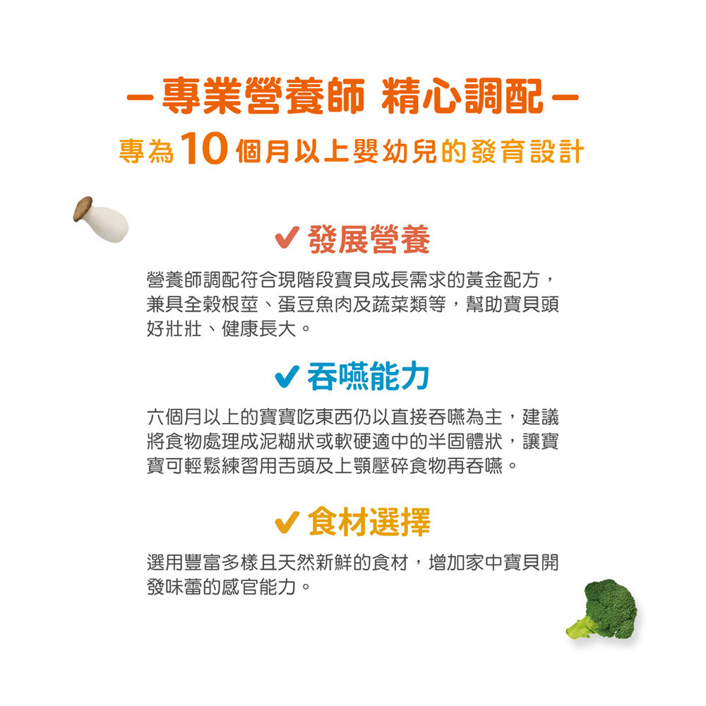 ✓ 發展營養-營養師調配符合現階段寶貝成長需求的黃金配方,兼具全榖根莖、蛋豆魚肉及蔬菜類等,幫助寶貝頭好壯壯、健康長大。