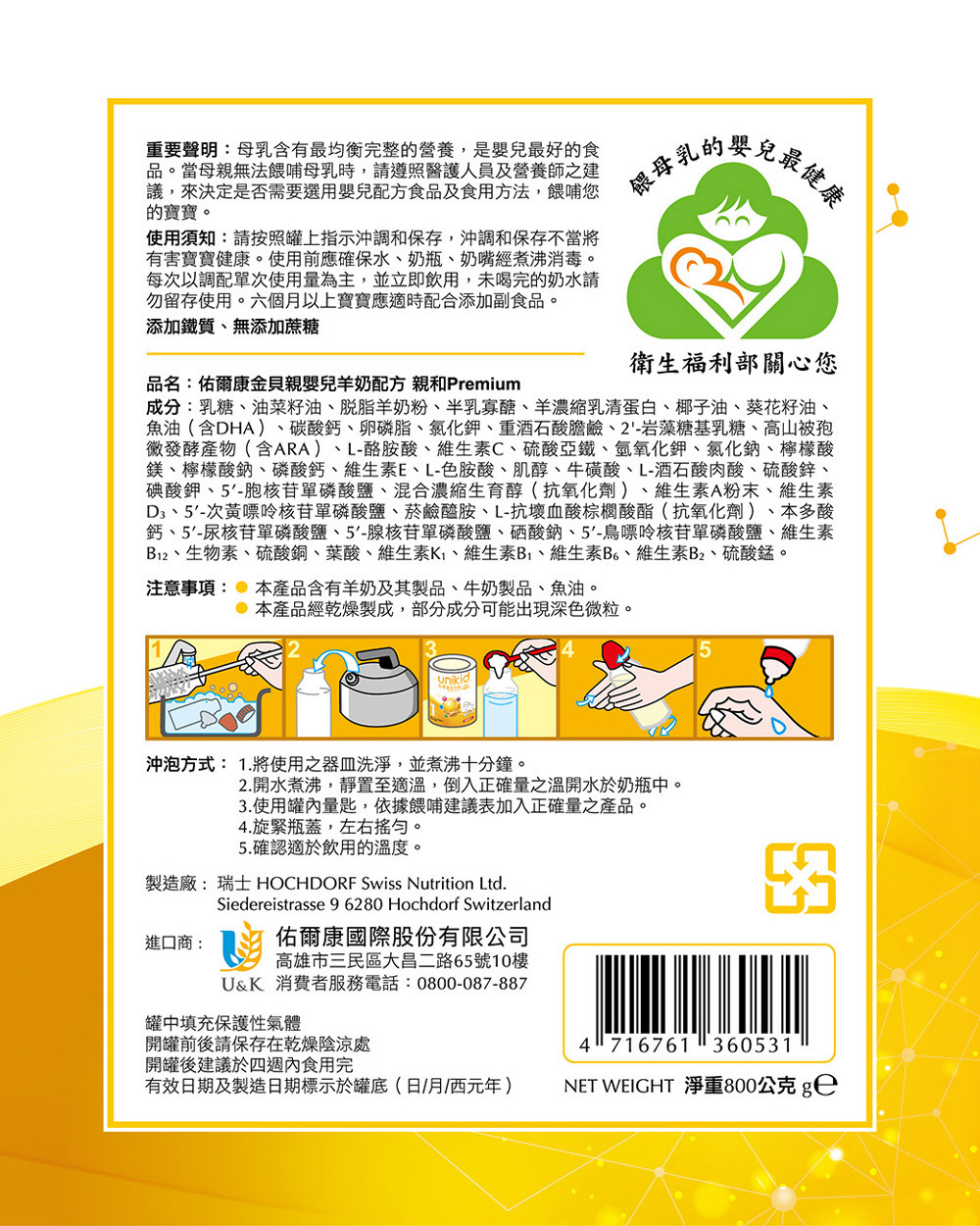 佑爾康金貝親 嬰兒羊奶配方 親和Premium 800g/罐