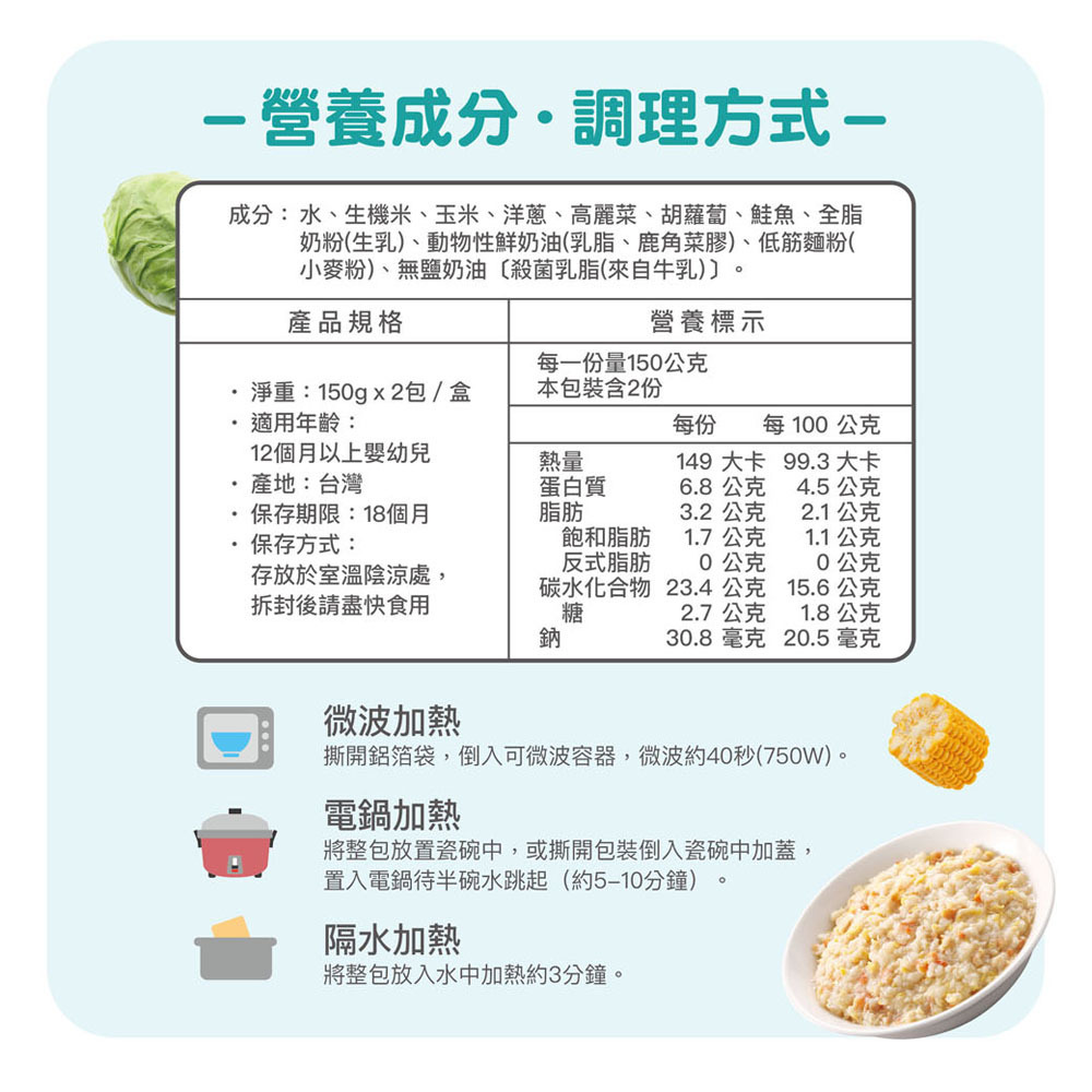 ✓ 發展營養-營養師調配符合現階段寶貝成長需求的黃金配方,兼具全榖根莖、蛋豆魚肉及蔬菜類等,幫助寶貝頭好壯壯、健康長大。