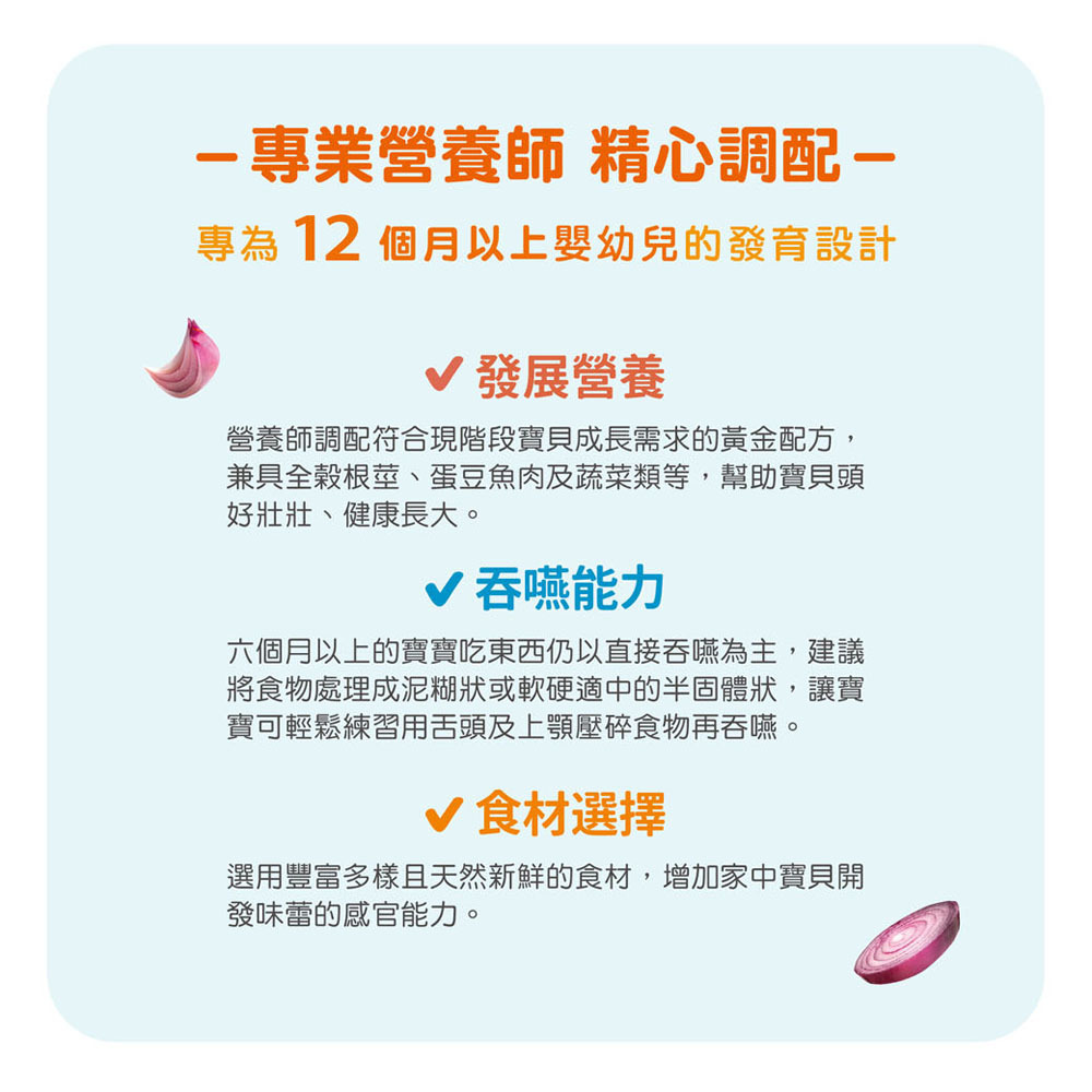 ✓ 食材選擇-選用豐富多樣且天然新鮮的食材,增加家中寶貝開發味蕾的感官能力。