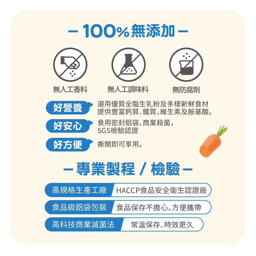 ✓ 發展營養-營養師調配符合現階段寶貝成長需求的黃金配方,兼具全榖根莖、蛋豆魚肉及蔬菜類等,幫助寶貝頭好壯壯、健康長大。