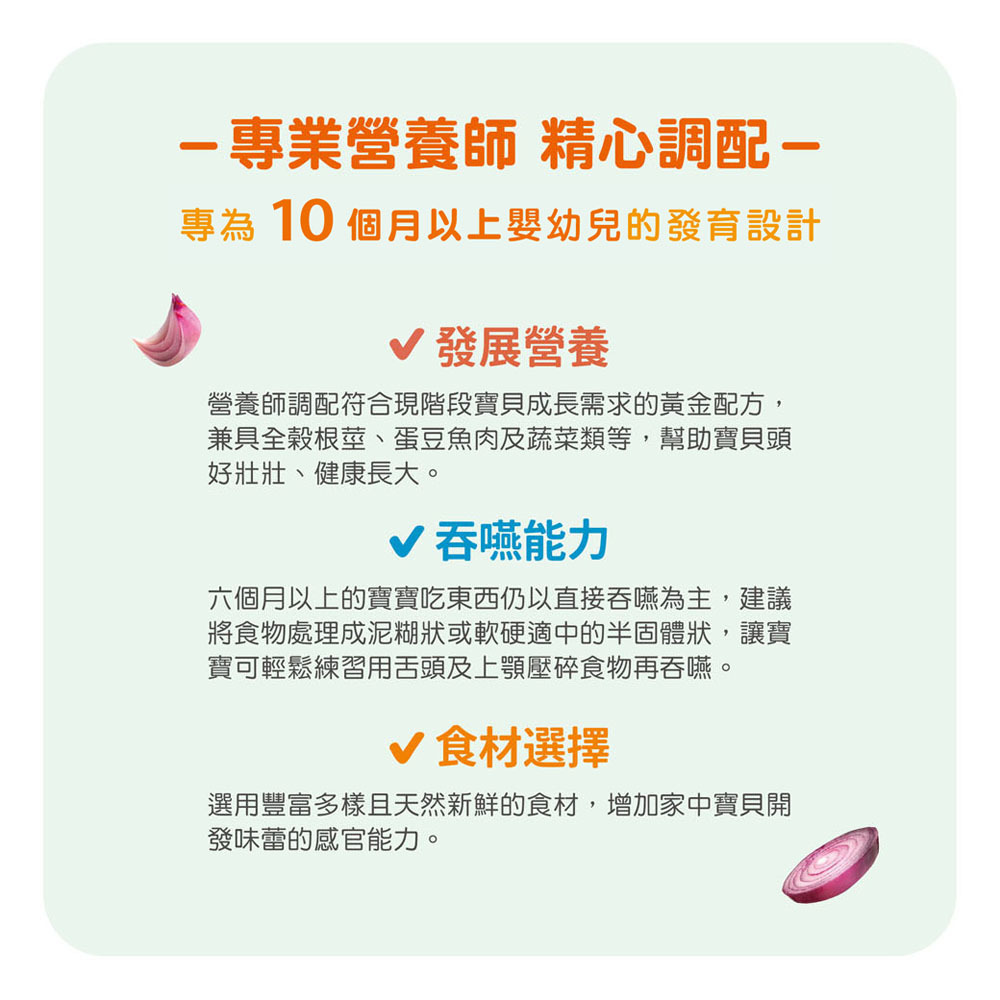 ✓ 食材選擇-選用豐富多樣且天然新鮮的食材,增加家中寶貝開發味蕾的感官能力。