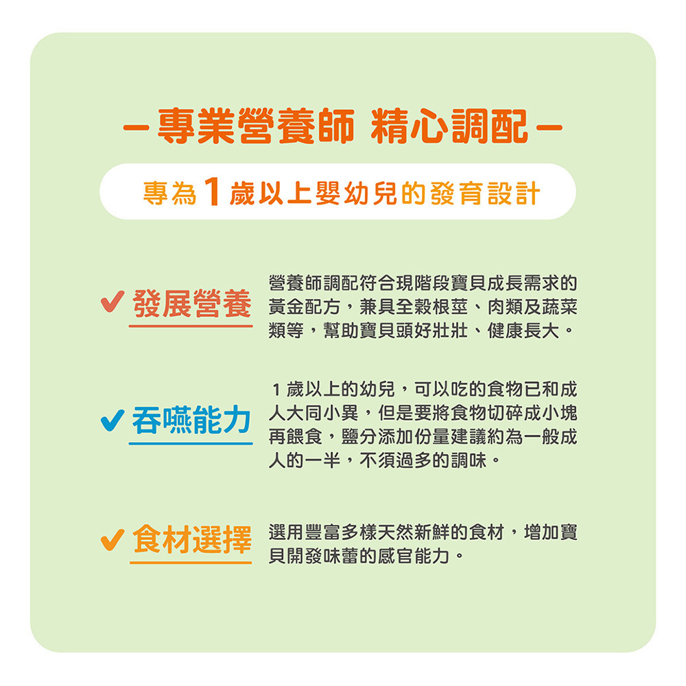 ✓ 發展營養-營養師調配符合現階段寶貝成長需求的黃金配方,兼具全榖根莖、 肉類及蔬菜類等,幫助寶貝頭好壯壯、健康長大。