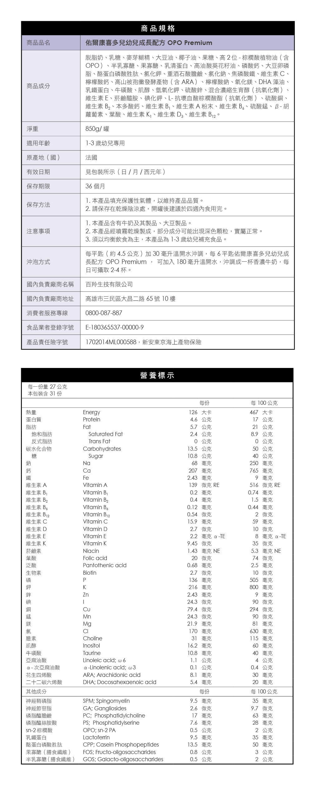 佑爾康金貝親 兒童配方 OPO Premium 850g/罐