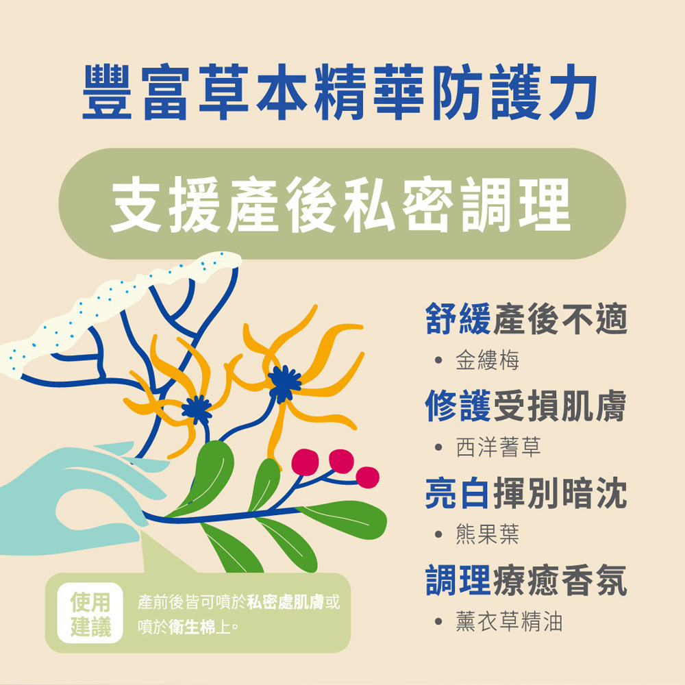 每日可多次適量噴於私密處或護墊上,讓產後護理更便利。