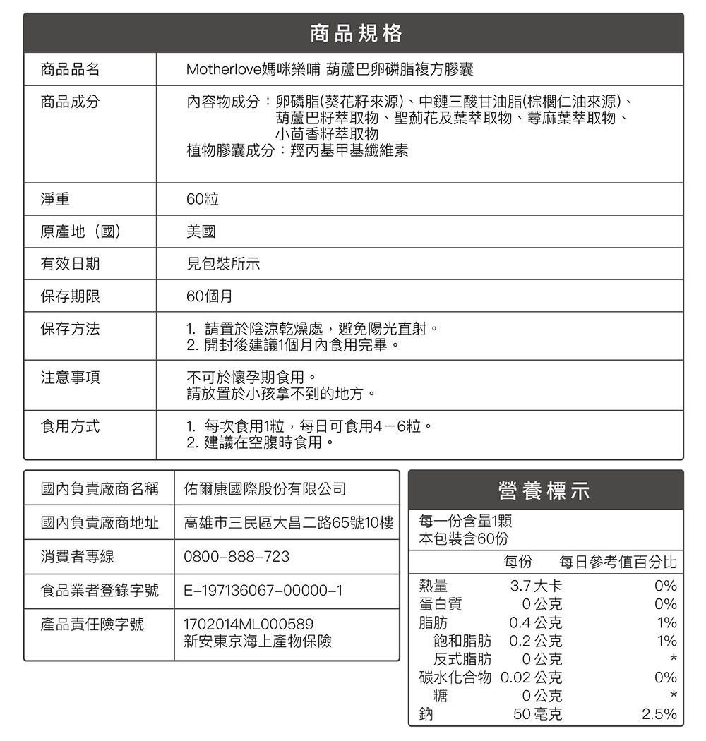Motherlove媽咪樂哺 葫蘆巴卵磷脂複方膠囊 60顆/罐
