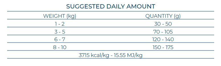 粗蛋白 26%、粗脂肪 13%、粗纖維 2.6%、粗灰分 7.4%、Omega-3+Omega-6 2.7%。