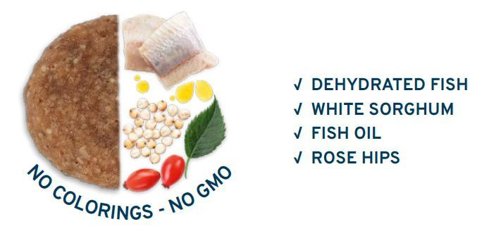 魚、白高粱、玉米、米糠、雞脂、玉米麩、甜菜纖維、魚水解蛋白、魚油、礦物質、甘露寡糖(MOS)、果寡糖(FOS)、絲蘭。