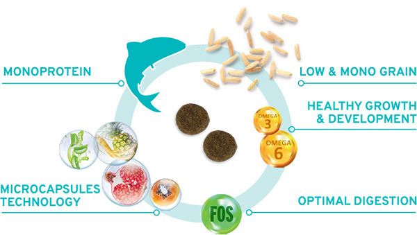魚、白米、豌豆澱粉、米糠、豌豆、鮭魚油、玉米蛋白、啤酒酵母、魚水解蛋白、礦物質、甘露寡糖(MOS)、果寡糖(FOS)、舞茸、蔬果加工物(番木瓜、鳳梨) 、絲蘭、蘆薈、蝦紅素。