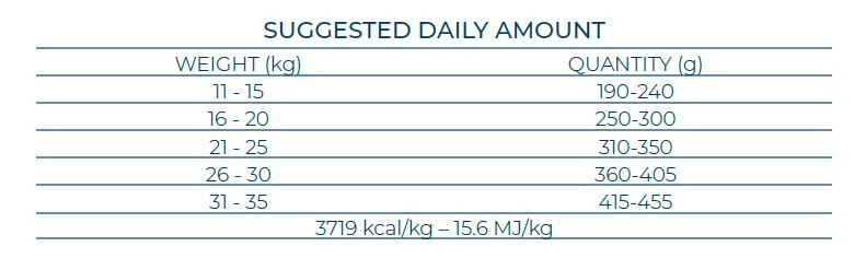 粗蛋白 26%、粗脂肪 13%、粗纖維 2.5%、粗灰分 7.5%、Omega-3 0.8%、Omega-6 2.4%。