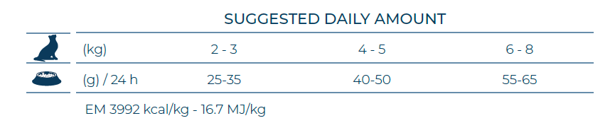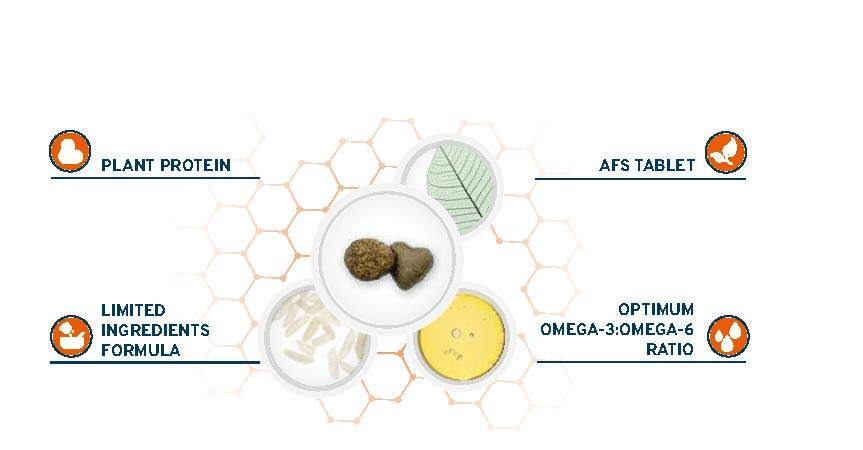 白米、魚油、魚水解蛋白、(AFS: 馬鈴薯蛋白、魚水解蛋白、山柳菊、三葉草、蔓越莓乾、熊果葉)、馬鈴薯蛋白、玉米蛋白、魚、米粉、甜菜泥、褐藻乾、甘露寡糖(MOS)、果寡糖(FOS)、絲蘭。